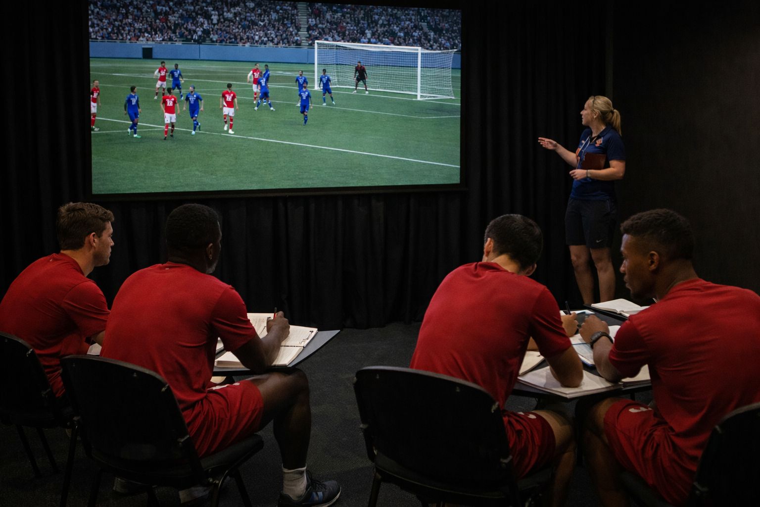 Have a clip paused as players arrive to training with a question on the screen — What could we do defensively to stop the opposition from scoring?